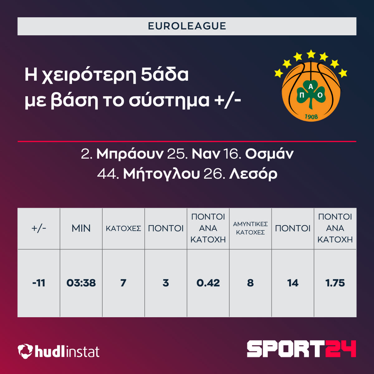Το SPORT24 αναλύει με την βοήθεια του Hudl Instat την ήττα του Παναθηναϊκού AKTOR.