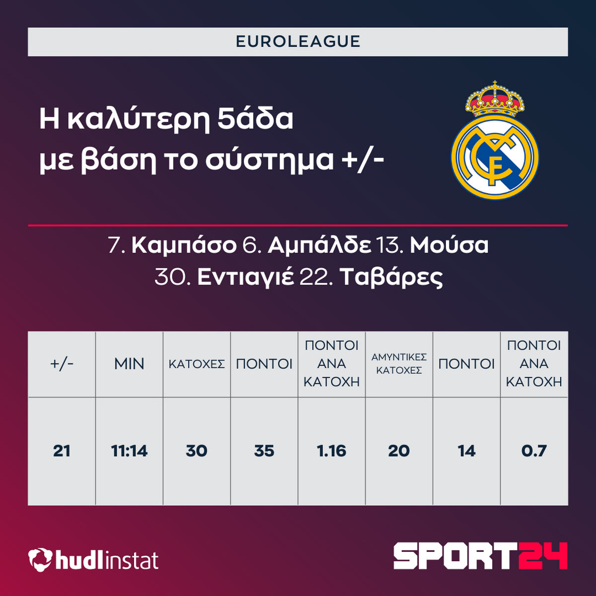 Το +21 της βασικής πεντάδας της Ρεάλ και το -11 του Παναθηναϊκού AKTOR