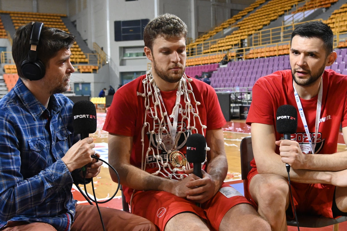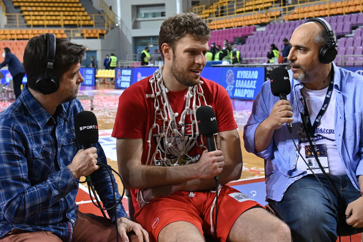 Την συνέντευξη ξεκίνησε ο Σάσα Βεζένκοβ που δήλωσε: “Δύσκολο ματς, είχαμε πρόβλημα για τρία δεκάλεπτα και έβαλαν μεγάλα σουτ. Έγινε ένας ωραίος τελικός και είμαστε ευχαριστημένοι που κερδίσαμε. Σίγουρα το να χάσεις βολές είναι πως θα το διαχειριστείς μετά. Συνέβη και παίζει και η κούραση ρόλο. Παίζουμε, γκρινιάζουμε. Δεν παίζουμε πάλι να γκρινιάζουμε;