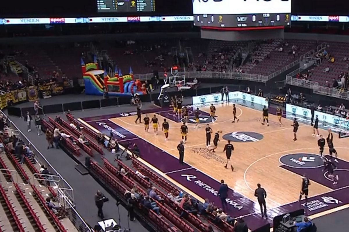 Οι γηπεδούχοι τοποθέτησαν έναν φουσκωτό παιδότοπο πίσω από τη μία μπασκέτα για τους μικρούς φίλους της ομάδας, με τα πλάνα από τη Λετονία να αναδεικνύονται στο VIDEO.