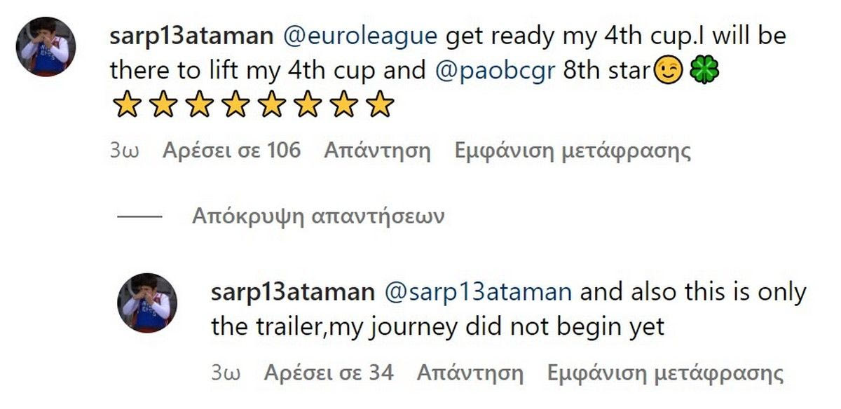 Ο μικρός Σαρπ δεν έχασε ευκαιρία και σχολίασε στο εν λόγω post, σημειώνοντας: “EuroLeague ετοιμάσου για το 4ο τρόπαιό μου. Θα είμαι εκεί να σηκώσω την 4η μου κούπα και ο Παναθηναϊκός (σσ. να ράψει) το 8ο αστέρι του”. Λίγο αργότερα συμπλήρωσε: “Αυτό είναι μόνο το τρέιλερ. Η δική μου διαδρομή δεν έχει αρχίσει ακόμα”.