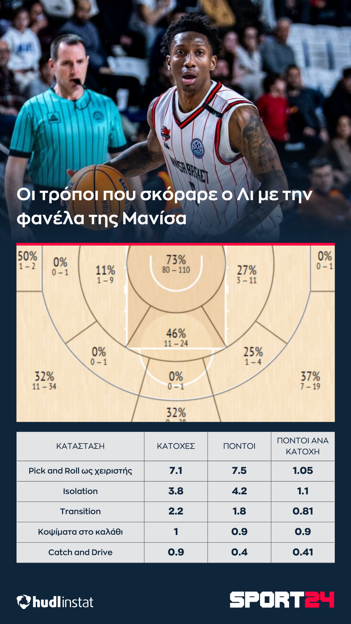 Ένα ζήτημα πάντως στην περίπτωση του Λι – σχετικά με το πώς θα ταιριάξει στον Ολυμπιακό – είναι ότι πρόκειται για παίκτη που θέλει την μπάλα στα χέρια του. Σύμφωνα με το Hudl Instat, στην Μανίσα ο Αμερικανός γκαρντ είχε Usage Rate (μετάφραση: Κατοχές της ομάδας που τελείωνε αυτός όταν ήταν στο παρκέ) 28.8%. Στον φετινό Ολυμπιακό κανείς δεν έχει πάνω από 27% (Ο Φουρνιέ για την ακρίβεια έχει 26.8% και ο Βεζένκοβ 26%) και – προφανώς – δύσκολα ο Λι θα φτάσει σε αυτό το ύψος. Εκτός αν προτιμηθεί να αναλάβει τις επιθέσεις όταν ξεκουράζονται οι Φουρνιέ και Βεζένκοβ (στον ρόλο δηλαδή που έχει ο ΜακΚίσικ, που πάντως έχει Usage Rate 22.4%).