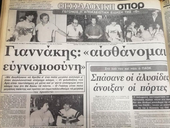 Η υπόθεσης της μετακίνησης του Παναγιώτη Γιαννάκη, ο οποίος επέστρεψε στην Θεσσαλονίκη πλέον από την θέση του προπονητή, από τον Ιωνικό στον Άρη πριν από 33 χρόνια ήταν… μυθιστορηματική. Για την ολοκλήρωση της μεταγραφής του χρειάσθηκε να κινητοποιηθούν δεκάδες παράγοντες από την οικογένεια του συλλόγου.