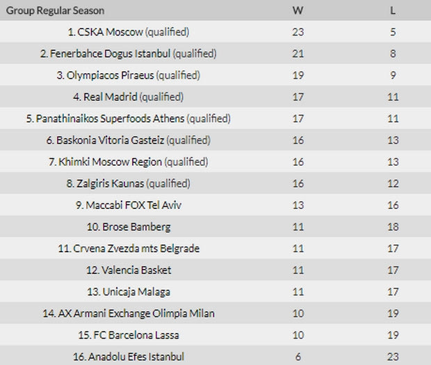 Σε πενταπλή ισοβαθμία με Ρεάλ Μαδρίτης, Μπασκόνια, Χίμκι και Ζάλγκιρις η κατάταξη θα έχει ως εξής: