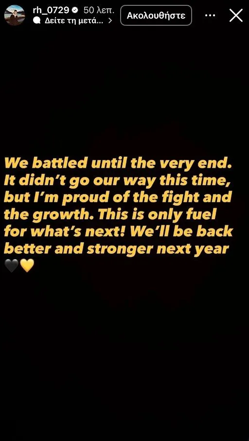“Παλέψαμε μέχρι το τέλος. Δεν πήγε όπως θέλαμε αυτή τη φορά, αλλά είμαι περήφανος για την μάχη και την εξέλιξη. Αυτό είναι απλά κίνητρο για τα όσα ακολουθούν. Θα επιστρέψουμε καλύτεροι και πιο δυνατοί την επόμενη χρονιά”.