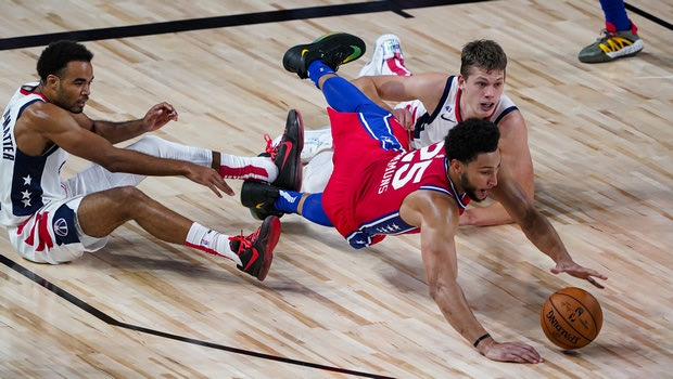 Philadelphia 76ers guard Ben Simmons (25) goes for a loose ball with Washington Wizards guard Jerome Robinson, left, and forward Moritz Wagner, right. during the first half of an NBA basketball game Wednesday, Aug. 5, 2020 in Lake Buena Vista, Fla. (AP Photo/Ashley Landis)