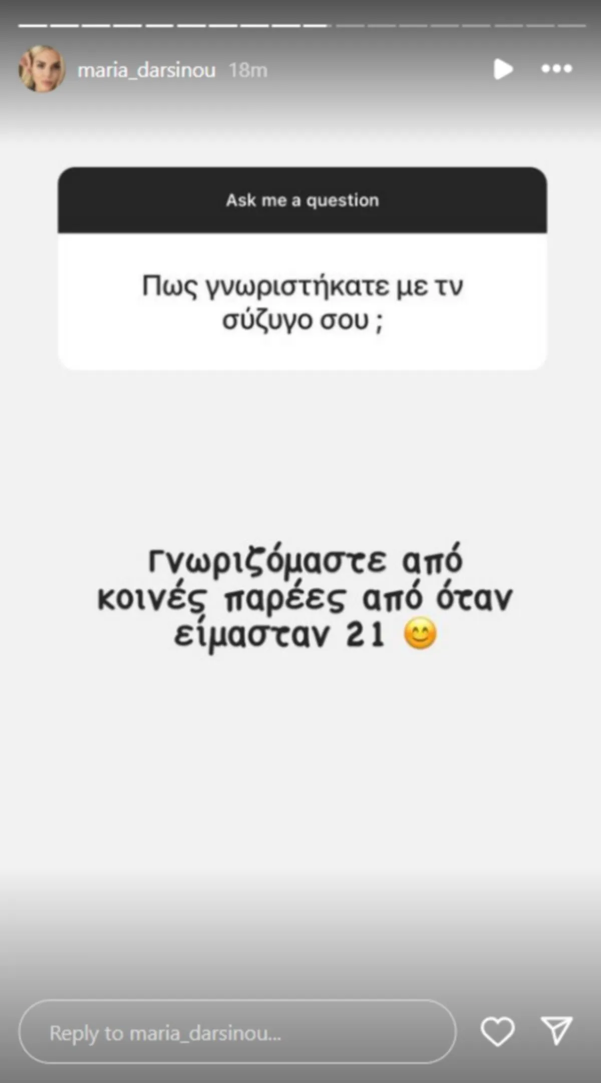 Συγκεκριμένα, όπως απάντησε σε μία από τις ερωτήσεις, που της έκαναν οι διαδικτυακοί της φίλοι στο Instagram, η γνωριμία τους έγινε, όταν οι δύο τους ήταν μόλις 21ος ετών, μέσα από κοινές παρέες.