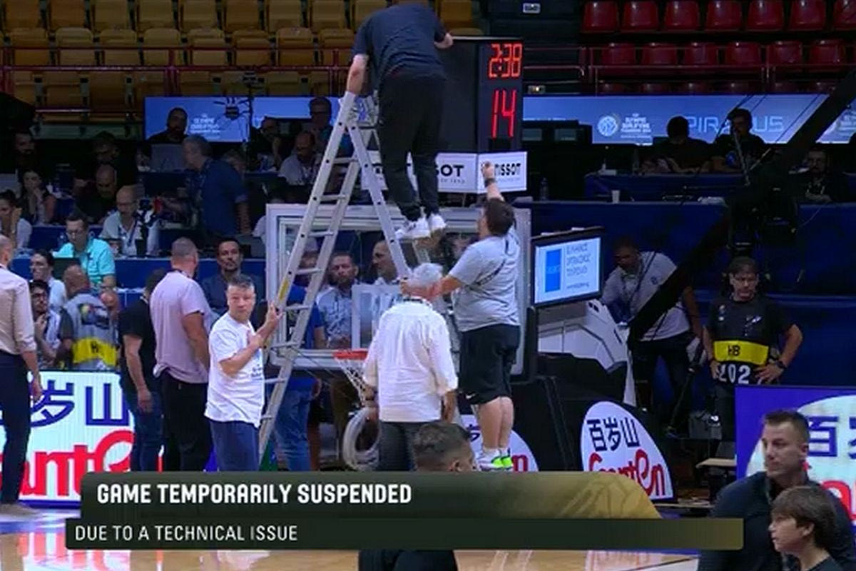 Για να επιδιορθώθεί το πρόβλημα που διέκριναν οι διαιτητές, οι αρμόδιοι κατέβασαν τη μπασκέτα που έκανε τις επιθέσεις της η Κροατία στο γ’ δεκάλεπτο, με το παιχνίδι να διακόπτεται για μερικά λεπτά.