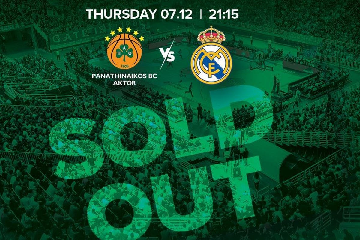 Εισιτήρια τέλος για τον αγώνα της Πέμπτης (7/12 στις 21:15) ανάμεσα στον Παναθηναϊκό AKTOR και τη Ρεάλ Μαδρίτης για τη 12η αγωνιστική της EuroLeague, με την πράσινη ΚΑΕ να ενημερώνει το βράδυ της Δευτέρας (4/12) για το πρώτο sold-out της σεζόν.