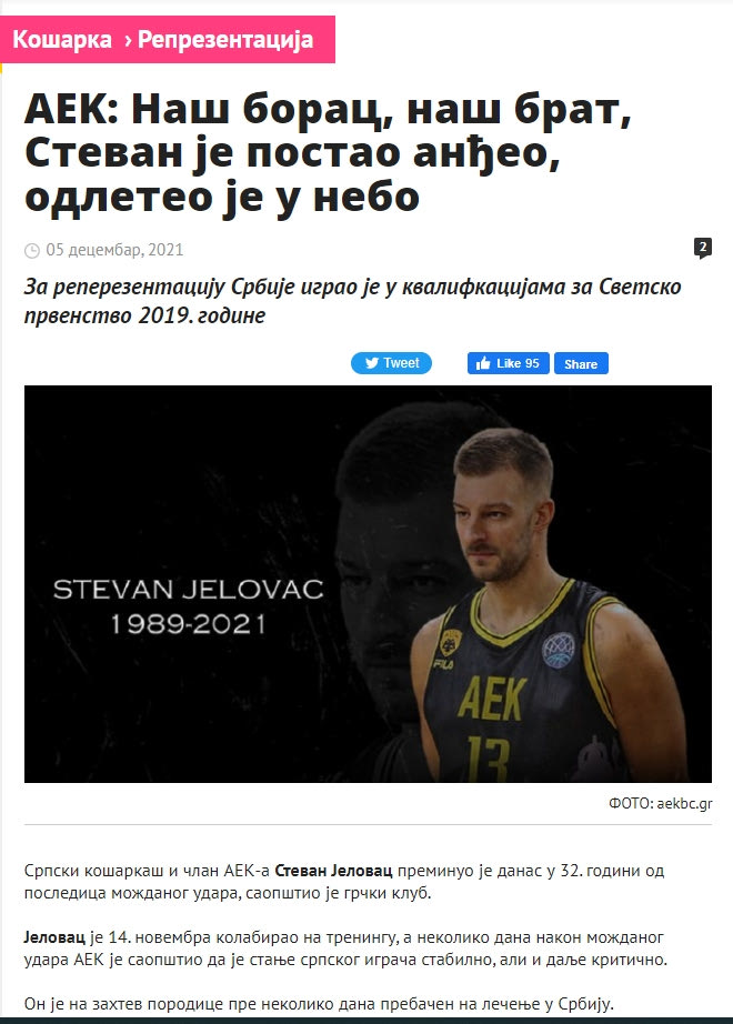 Η είδηση του θανάτου του Στέβαν Γέλοβατς σε ηλικία μόλις 32 ετών σκόρπισε θλίψη στον κόσμο του μπάσκετ. Ο αδικοχαμένος αθλητής της ΑΕΚ πάλευε για περίπου δύο εβδομάδες στο νοσοκομείο, όντας σε καταστολή, αλλά έχασε τη μάχη με τη ζωή αφήνοντας την τελευταία πνοή του στην πατρίδα του, τη Σερβία.