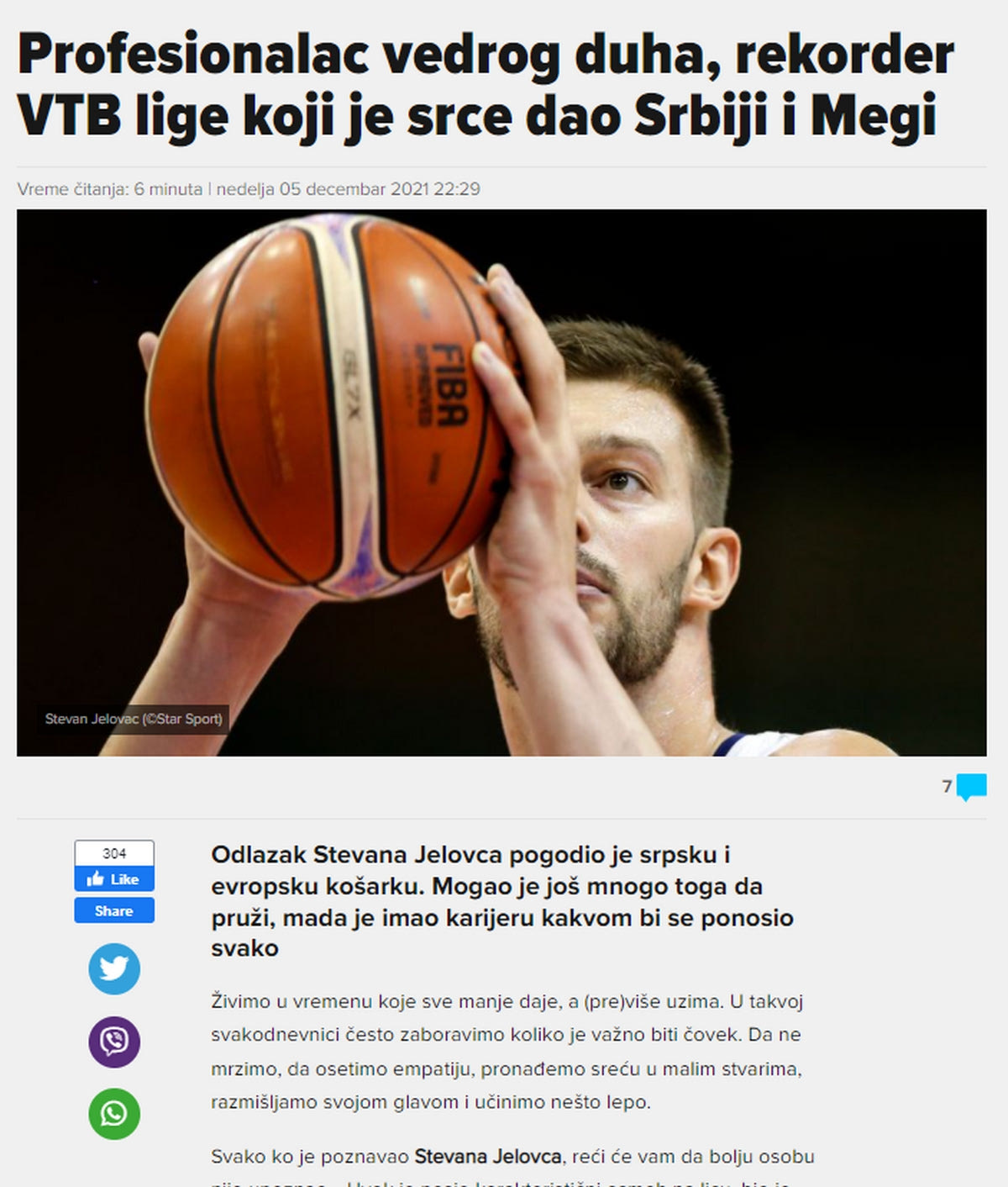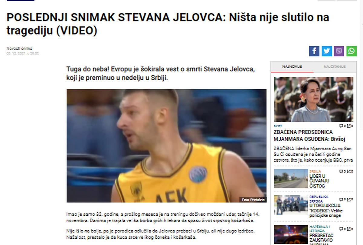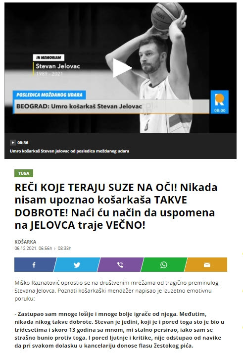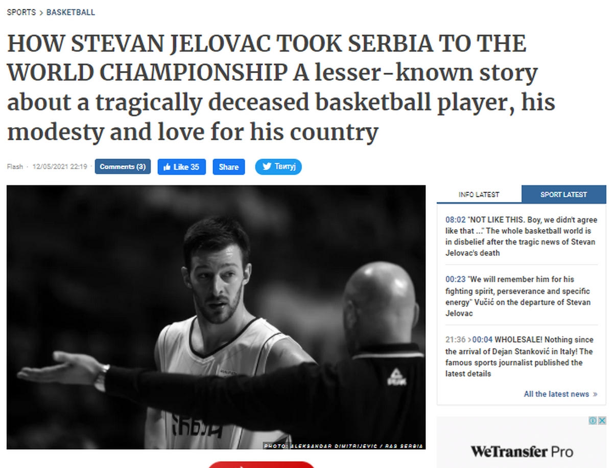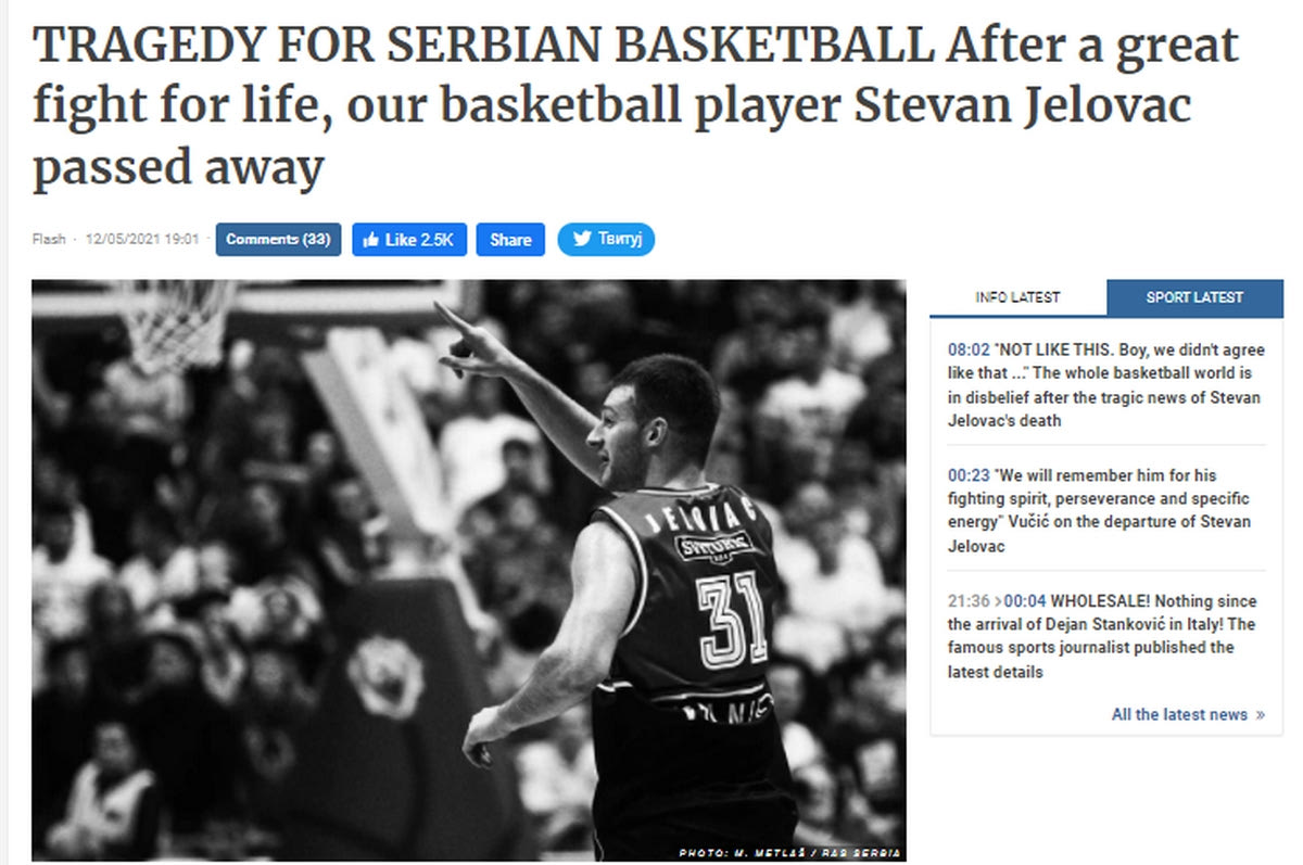 Θλίψη έχει προκαλέσει σε ολόκληρο τον μπασκετικό κόσμο ο τόσο πρόωρος θάνατος του Στέβαν Γέλοβατς σε ηλικία μόλις 32 ετών, με την είδηση του θανάτου του ν' απασχολεί φυσικά τα σερβικά Μέσα.