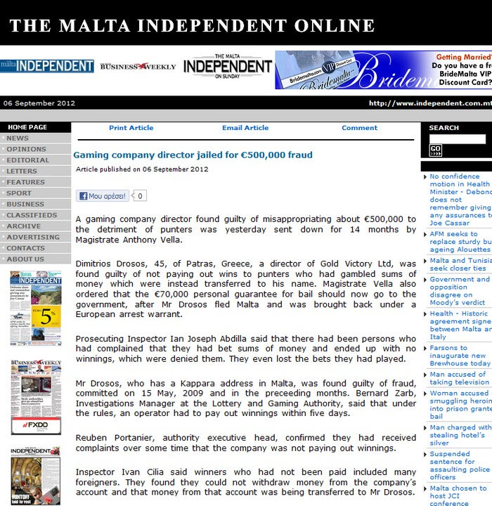 Για τον Δημήτρη Δρόσο, εκδόθηκε ευρωπαϊκό ένταλμα σύλληψης και τελικά εκδόθηκε στη Μάλτα. Όπως αναφέρεται στο www.independent.com.mt ο Έλληνας επιχειρηματίας κατηγορείται για απάτη που διέπραξε στις 15 Μαϊου του 2009, καθώς και στους μήνες που ακολούθησαν στη Μάλτα, όπου είχε έδρα η εταιρεία του.