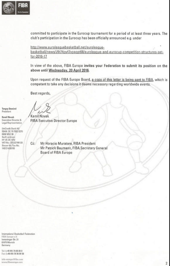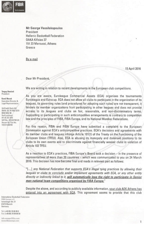 Τι σημαίνει αυτό; Αν δεν προχωρήσει στην αποβολή της ΑΕΚ από το πρωτάθλημα (σ.σ.: αυτή είναι η συνέπεια που ζητά η FIBA), τότε η Εθνική ομάδα θα χάσει το δικαίωμα συμμετοχής στο Eurobasket 2017, ενδεχομένως και στο Προολυμπιακό της Ιταλίας.