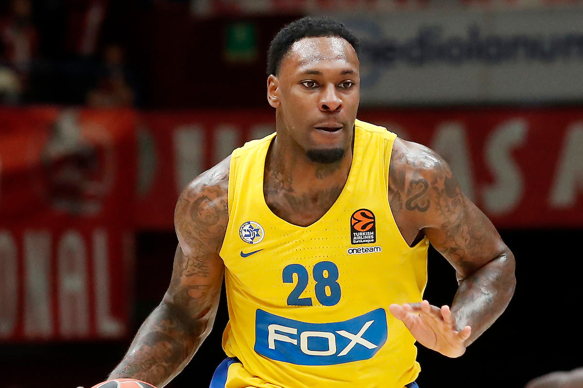 Maccabi Fox Tel Aviv's Tarik Black controls the ball during the Euro League basketball match between Olimpia Milan and Maccabi Fox Tel Aviv, in Milan, Italy, Tuesday, Nov. 19, 2019. (AP Photo/Antonio Calanni) 2019 AP Photo/Antonio Calanni