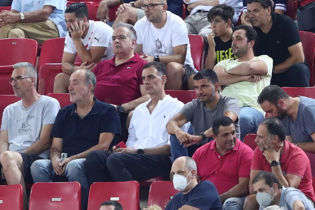 Ο προπονητής του τμήματος μπάσκετ ανδρών δεν πήγε, πάντως, στην εξέδρα των VIPs, αλλά στη Θύρα 17, μαζί με τους οπαδούς των ερυθρόλευκων, αρκετοί από τους οποίους τον κατάλαβαν αμέσως και τον αποθέωσαν για την περσινή πορεία, για το πρωτάθλημα, το κύπελλο και τη συμμετοχή στο Final Four της EuroLeague.
