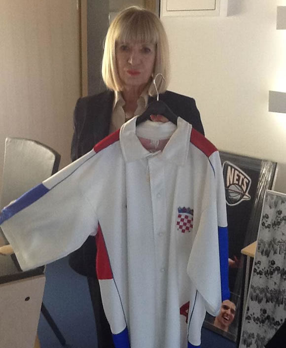 - Από το “κρυφό δωματιάκι” έβγαλε και μας έδειξε την φόρμα με την οποία έκανε ζέσταμα στον αλησμόνητο τελικό του Ολυμπιακού τουρνουά της Βαρκελώνης μεταξύ της Κροατίας και της πρώτης –άρα αυθεντικής- Dream Team των ΗΠΑ.