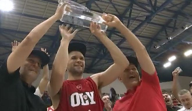 Η στιγμή που ο Ολυμπιακός σήκωσε το τρόπαιο του Stoiximan Super Cup, μετά τη νίκη του στον τελικό με τον Παναθηναϊκό AKTOR στο κλειστό Καλλιθέας Ρόδου.