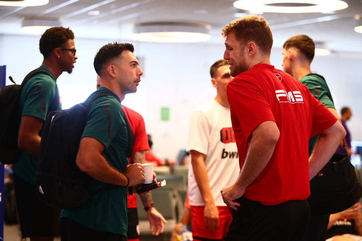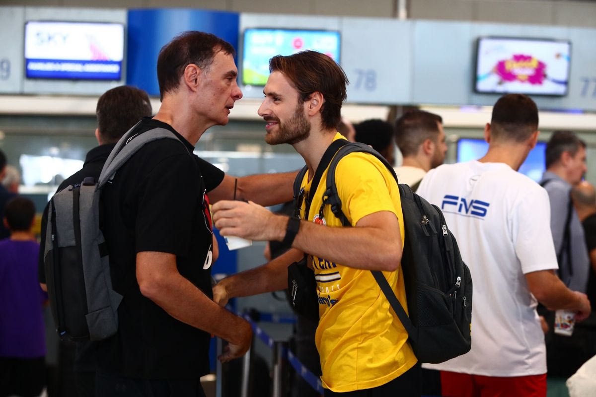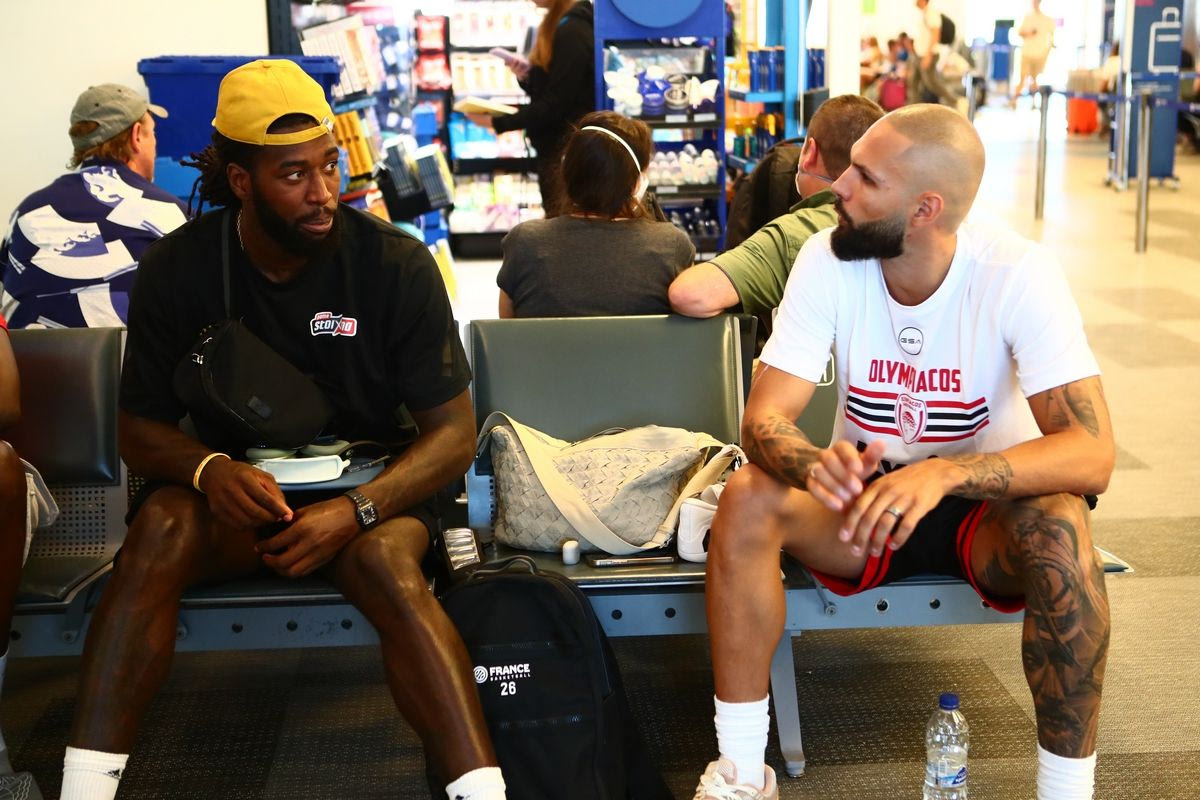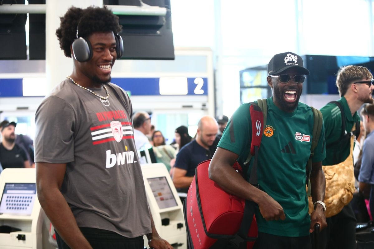 Ο φωτογραφικός φακός απαθανάτισε τα στιγμιότυπα από την κοινή παρουσία των ομάδων στο “Ελευθέριος Βενιζέλος”, με τα “κλικ” να αναδεικνύουν τους αθλητές να ανταλλάσσουν μερικά λόγια πριν από την πτήση για το νησί, στο οποίο θα διεκδικήσουν τον πρώτο τίτλο της σεζόν.