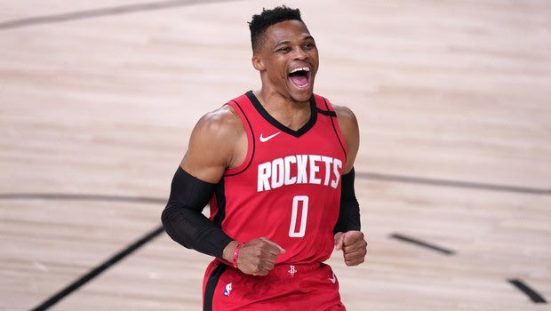 Ο Ράσελ Γουέστμπρουκ πανηγυρίζει ένα καλάθι με τη φανέλα των Χιούστον Ρόκετς AP Photo/Mark J. Terrill