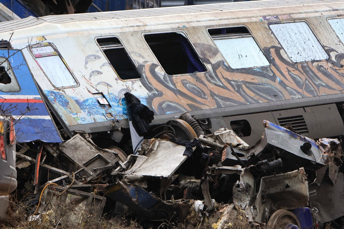Βαγόνι από το επιβατικό τρένο που συγκρούστηκε με εμπορική αμαξοστοιχία στα Τέμπη