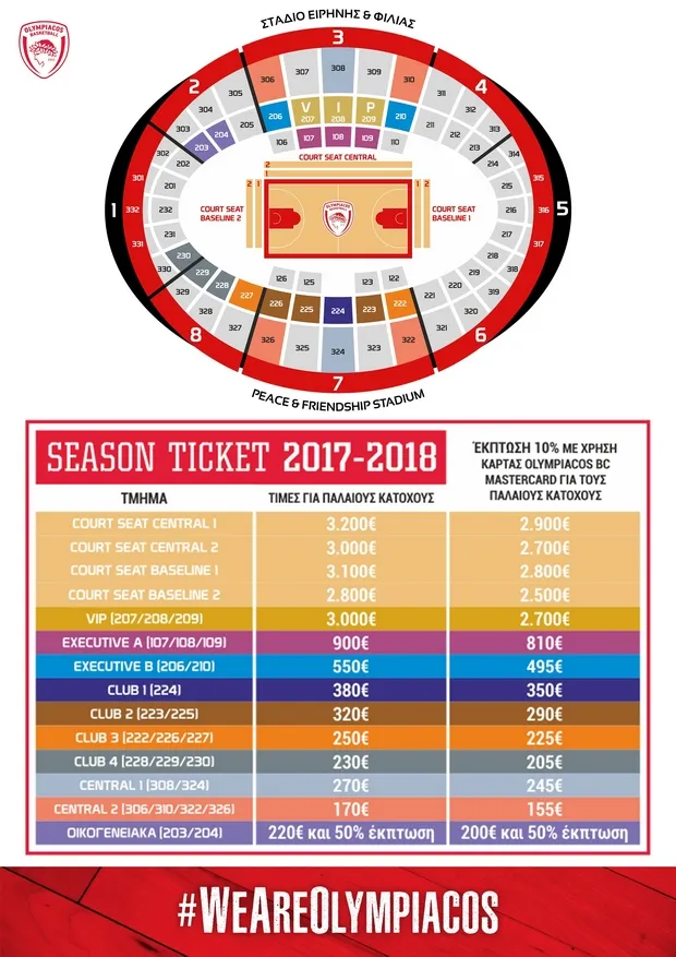 Μπορείτε να απευθυνθείτε στην Κ.Α.Ε. ΟΛΥΜΠΙΑΚΟΣ για να δείτε την διαθεσιμότητα στις ελεύθερες θέσεις. Από την Δευτέρα 24/07/2017 όλες οι θέσεις θα διατίθενται στους φιλάθλους που ενδιαφέρονται σε τιμές που προβλέπονται για τους νέους κατόχους και είναι λίγο υψηλότερες από αυτές που αφορούν τους παλαιούς κατόχους.