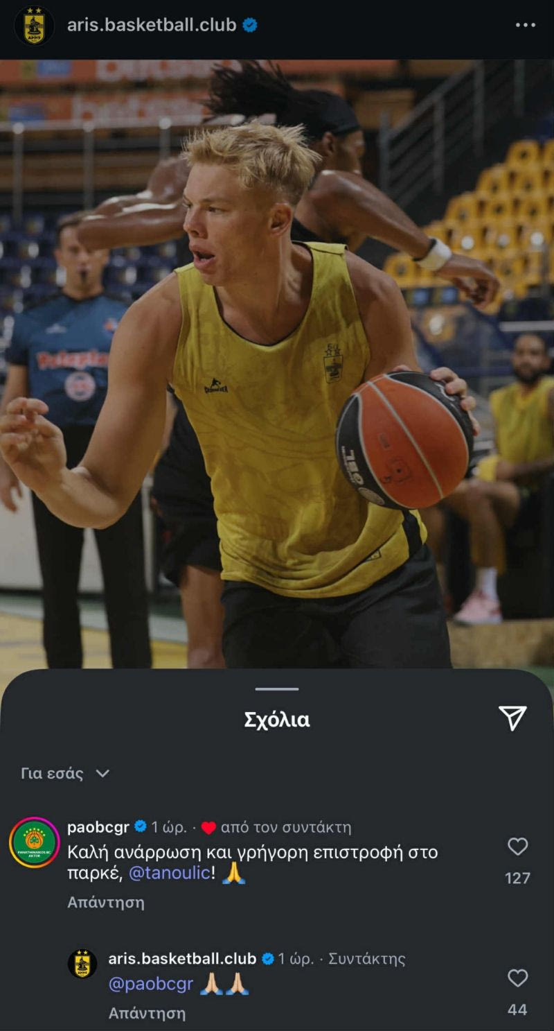 “Καλή ανάρρωση και γρήγορη επιστροφή στα παρκέ“, έγραψε η “πράσινη” ΚΑΕ, με τον λογαριασμό του Άρη να απαντά στη συνέχεια με σχετικά emojis.