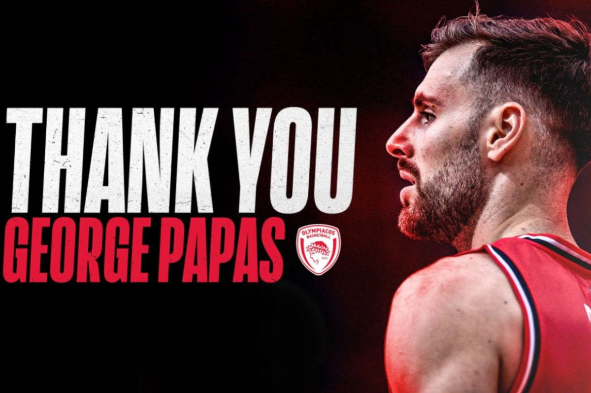 “H KAE Ολυμπιακός ανακοινώνει τη λύση της συνεργασίας της με τον Έλληνα γκαρντ, Τζορτζ Πάπας και του εύχεται καλή συνέχεια στην καριέρα του”.