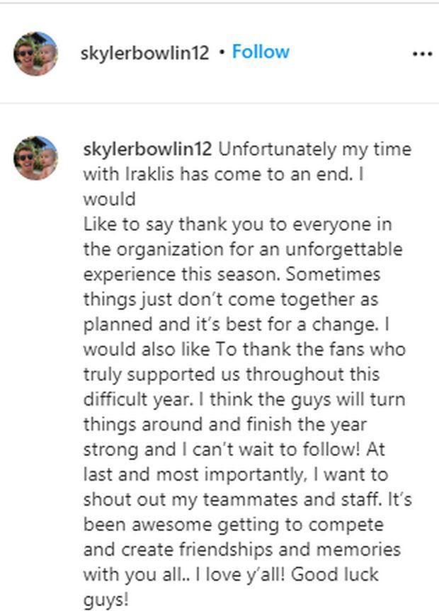 Ο Σκαίλερ Μπόουλιν δεν είναι πλέον παίκτης του Ηρακλή. Ο Αμερικανός γκαρντ αποχαιρέτησε τους συμπαίκτες του και τους φιλάθλους της ομάδας μέσω του λογαριασμού του στο Instagram, αναφέροντας μεταξύ άλλων ότι “καμία φορά τα πράγματα δεν πάνε όπως σχεδίασες και είναι καλύτερο να γίνει μία αλλαγή”.