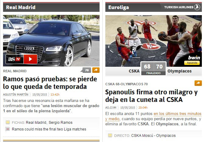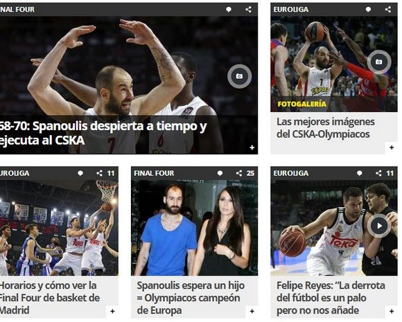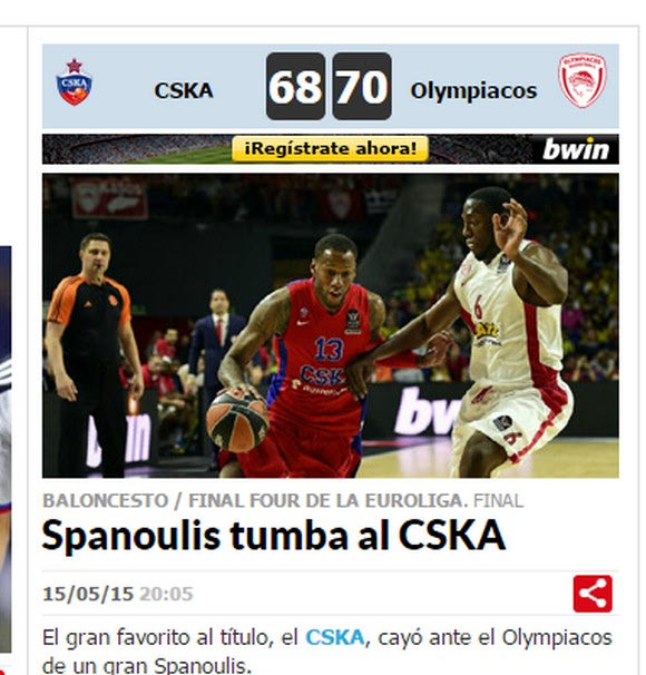 Η έτερη μεγάλη ιστοσελίδα της Μαδρίτης, “Marca”, τιτλοφορεί τη μεγάλη νίκη του Ολυμπιακού, στο final-4 της Μαδρίτης, ως εξής: “O Σπανούλης έριξε την ΤΣΣΚΑ. Η ιδιοφυΐα που λέγεται Σπανούλης έβαλε τον Ολυμπιακό στον τελικό. Εξαφανισμένος σε όλο το ματς, εμφανίστηκε το τέλος για να νικήσει.”