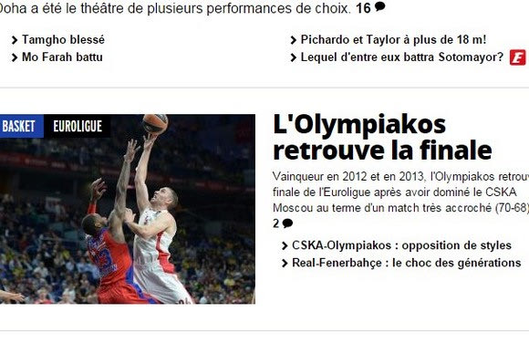 Στο ίδιο μήκος κύματος κι η γαλλική “L’ equipe” με τον “Ολυμπιακό να ξαναβρίσκει τον τελικό” και παραπομπές στα προηγούμενα επιτεύγματα των “ερυθρολεύκων”.
