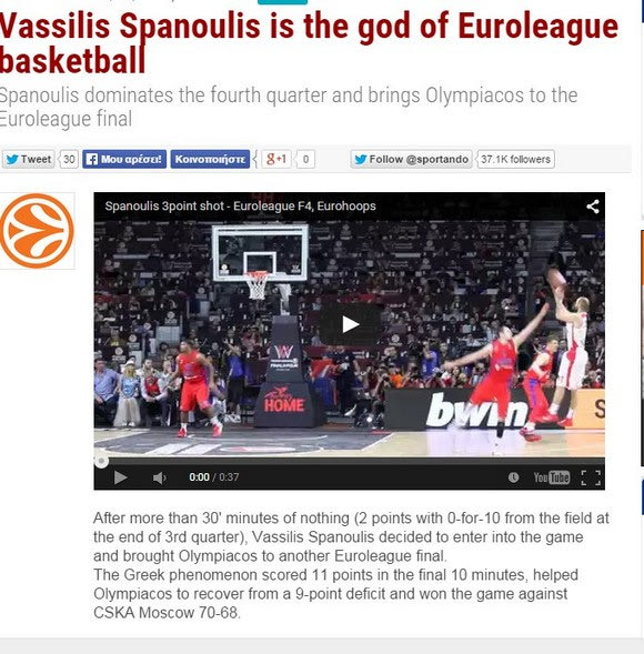 Το “Sportando” είναι ξεκάθαρο: “Βασίλης Σπανούλης είναι ο Θεός της Euroleague. Ο Σπανούλης κυριαρχεί στο τέταρτο δεκάλεπτο και φέρνει τον Ολυμπιακό στον τελικό.”