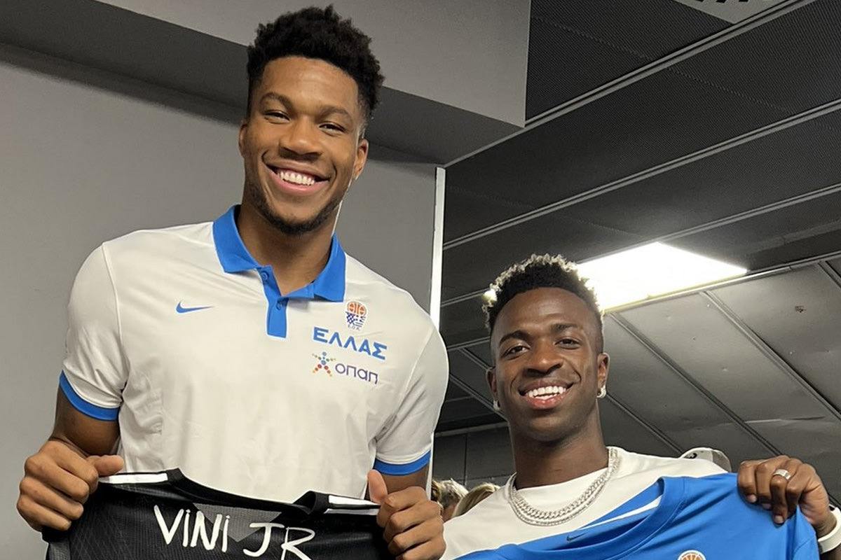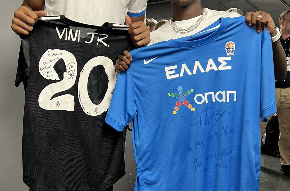 Highlight του ταξιδιού στην Ισπανία ήταν για τον Γιάννη Αντετοκούνμπο η συνάντηση με τον Βινίσιους. Δείτε τι έγραψαν οι δύο σταρ στις φανέλες που αντάλλαξαν.