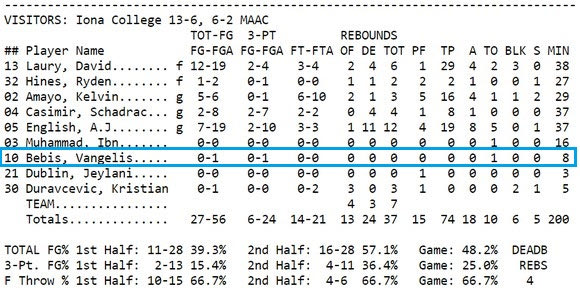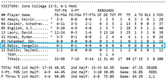 Μία νίκη (επί του Niagara με 80-79) και μία ήττα (από το Canisius με 78-74) ήταν ο απολογισμός του Iona γι αυτή την εβδομάδα. Ο Βαγγέλης Μπέμπης αγωνίστηκε μόνο στο δεύτερο παιχνίδι, δίχως να καταφέρει να σκοράρει (είχε 0/1 τρίποντα) στα οκτώ λεπτά που βρέθηκε στο παρκέ.
