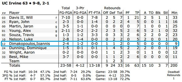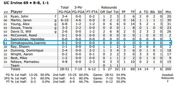 Το 2/2 έκαναν οι “Eaters” αφού νίκησαν τόσο το Cal State Fullerton (69-55) όσο και το CSUN (63-58), με τον ύψους 2μ18 φόργουορντ/σέντερ να σκοράρει συνολικά πέντε πόντους, σε δεκατέσσερα λεπτά συμμετοχής.