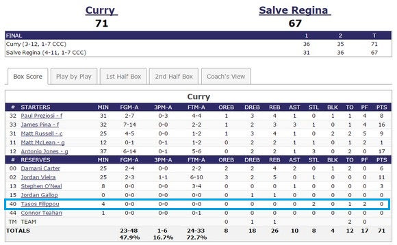 Ο πρωτοετής γκαρντ πήρε χρόνο συμμετοχής στη νίκη του Curry College επί του Salve Regina (71-67), δίχως όμως να σκοράρει. Αντίθετα, δεν αγωνίστηκε απέναντι στο Roger Williams (ήττα με 63-54).
