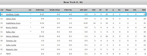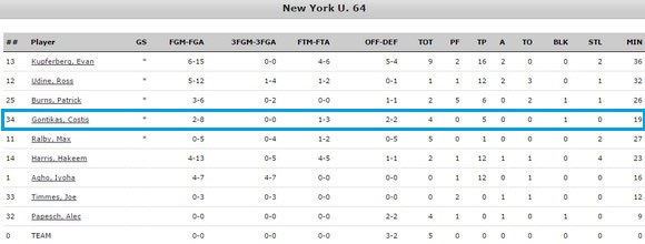 Μία καλή και μία μέτρια εμφάνιση έκανε ο τριτοετής σέντερ των “Violets”. Ο πρώην παίκτης του Παναθηναϊκού ήταν εξαιρετικής στη νίκη επί του Carnegie Mellon University με 86-83, ενώ έμεινε σε “ρηχά νερά”