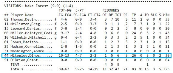 Οι “Demon Deacons” ηττήθηκαν μεν από το Syracuse με 86-83 στην παράταση, αλλά η εμφάνιση του Κώστα Μήτογλου ήταν εξαιρετική . Ο πρωτοετής παίκτης σημείωσε 26 πόντους (με 10/13 σουτ) και μάζεψε 6 ριμπάουντ απέναντι στους “Orange”, αναγκάζοντας τους πάντες να ασχοληθούν μαζί του.
