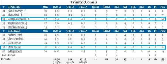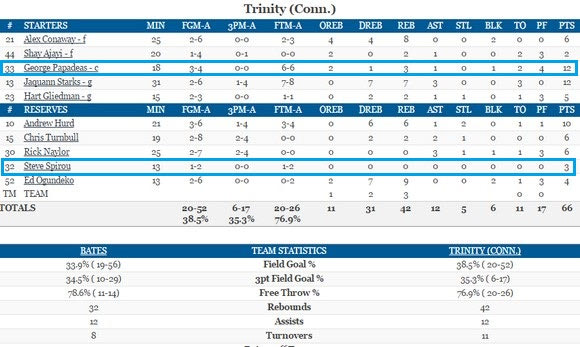 Το ελληνικό δίδυμο του Trinity είχε καλή παρουσία στα παιχνίδια με Bates (νίκη με 66-59) και Tufts (ήττα με 59-55), με τον Γιώργο Παπαδέα να κάνει τη διαφορά για την ομάδα του σε αμφότερες αναμετρήσεις, καθότι ήταν εκ των κορυφαίων σκόρερ της.