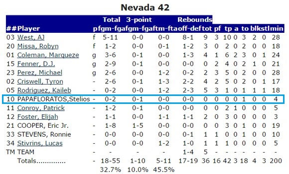 Ο πρώην παίκτης του Αμαρουσίου έπαιξε για τέσσερα λεπτά στη συντριβή του Nevada από το Colorado State με 98-42, δίχως όμως να καταφέρει να σκοράρει αφού είχε 0/1 δίποντα και 0/1 τρίποντα.
