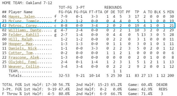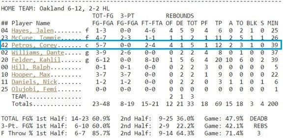 Το Oakland ξεπέρασε το εμπόδιο του Green Bay (με 69-66) και του Albion (με 83-68), με τον ομογενή πάουερ φόργουορντ να σκοράρει αρκετά (12 στο πρώτο και 19 στο δεύτερο).