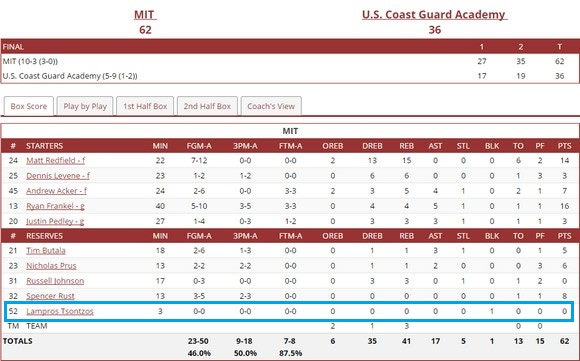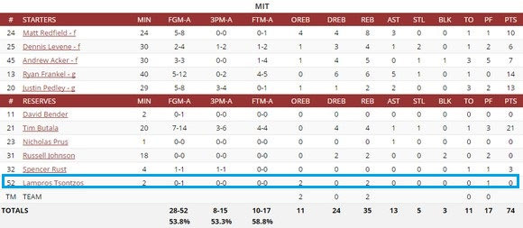 Το MIT έκανε το 2/2 αυτή την εβδομάδα κόντρα σε US Coast Guard Academy (62-36) και Springfield College (74-54), με τον τριτοετή σέντερ να αγωνίζεται για συνολικά πέντε λεπτά, μένοντας άποντος.
