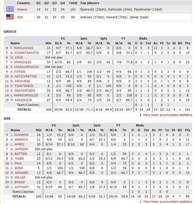 ” Δείξαμε σε όλους ότι δεν είμαστε πολύ καλοί αθλητές όπως αυτοί, αλλά ξέρουμε πως να παίζουμε μπάσκετ. Είμαστε έξυπνοι” είχε πει τότε ο Θοδωρής Παπαλουκάς, ο οποίος είχε μοιράσει 12 από τις 19 ασίστ της Εθνικής, διαλύοντας τους Αμερικανούς με τα pick ‘n’ rolls. ” Όλοι αυτοί οι παίκτες είναι μεγάλα αστέρια, ωστόσο πρέπει να κάνεις και μικρά πράγματα στο γήπεδο. Στην δική μας ομάδα όλοι ήξεραν ακριβώς τι πρέπει να κάνουν“.
