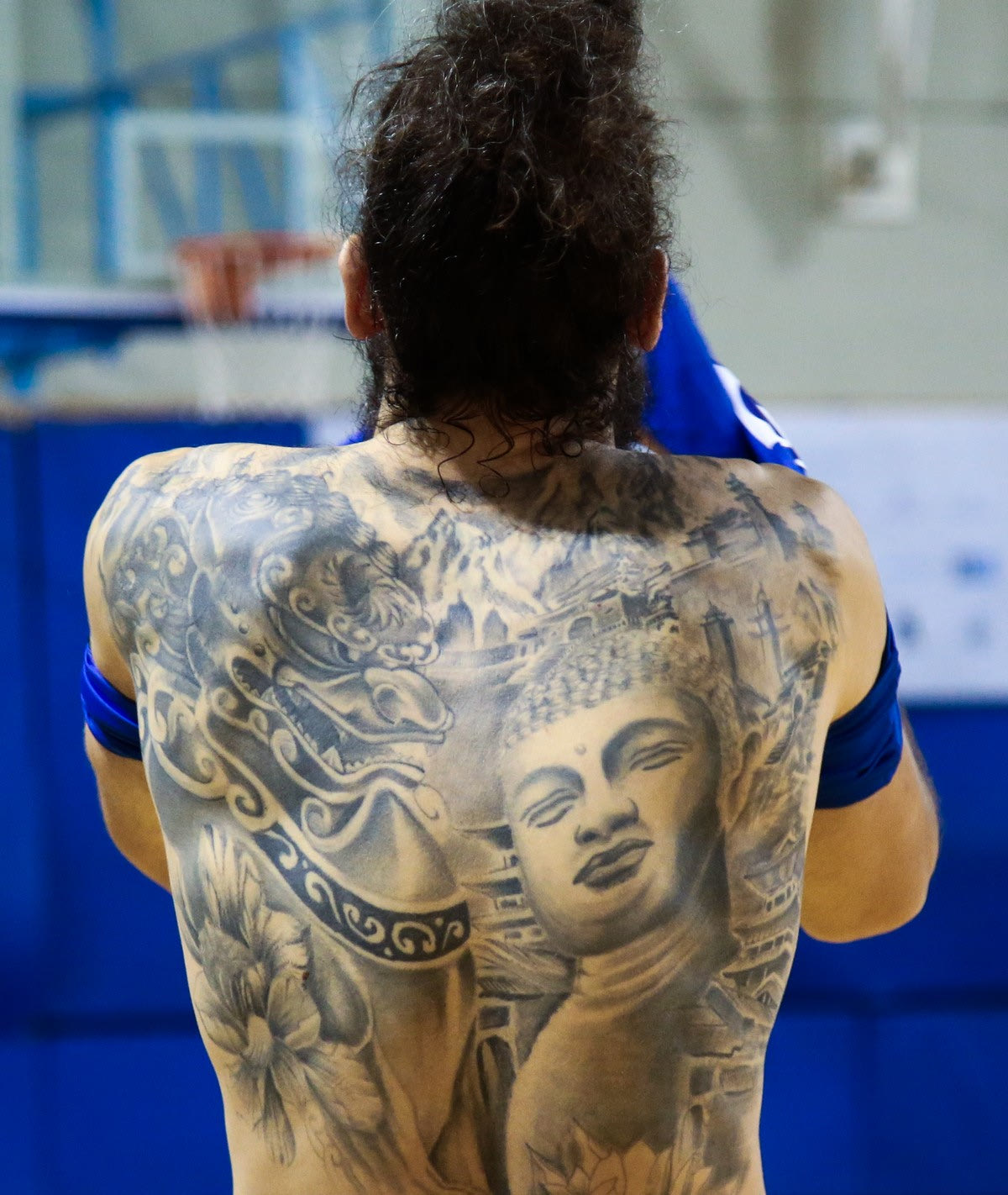 Το απίθανο τατουάζ στην πλάτη του Χάρη Γιαννόπουλου "έπιασε" ο φακός της Eurokinissi στην προπόνηση της εθνικής ομάδας μπάσκετ ανδρών.