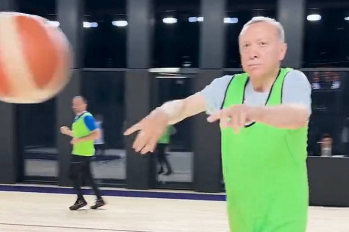 Με αθλητική αμφίεση και με μία μπάλα του μπάσκετ στα χέρια, ο Ρετζέπ Ταγίπ Ερντογάν πάτησε παρκέ και το έριξε στο μπάσκετ.
