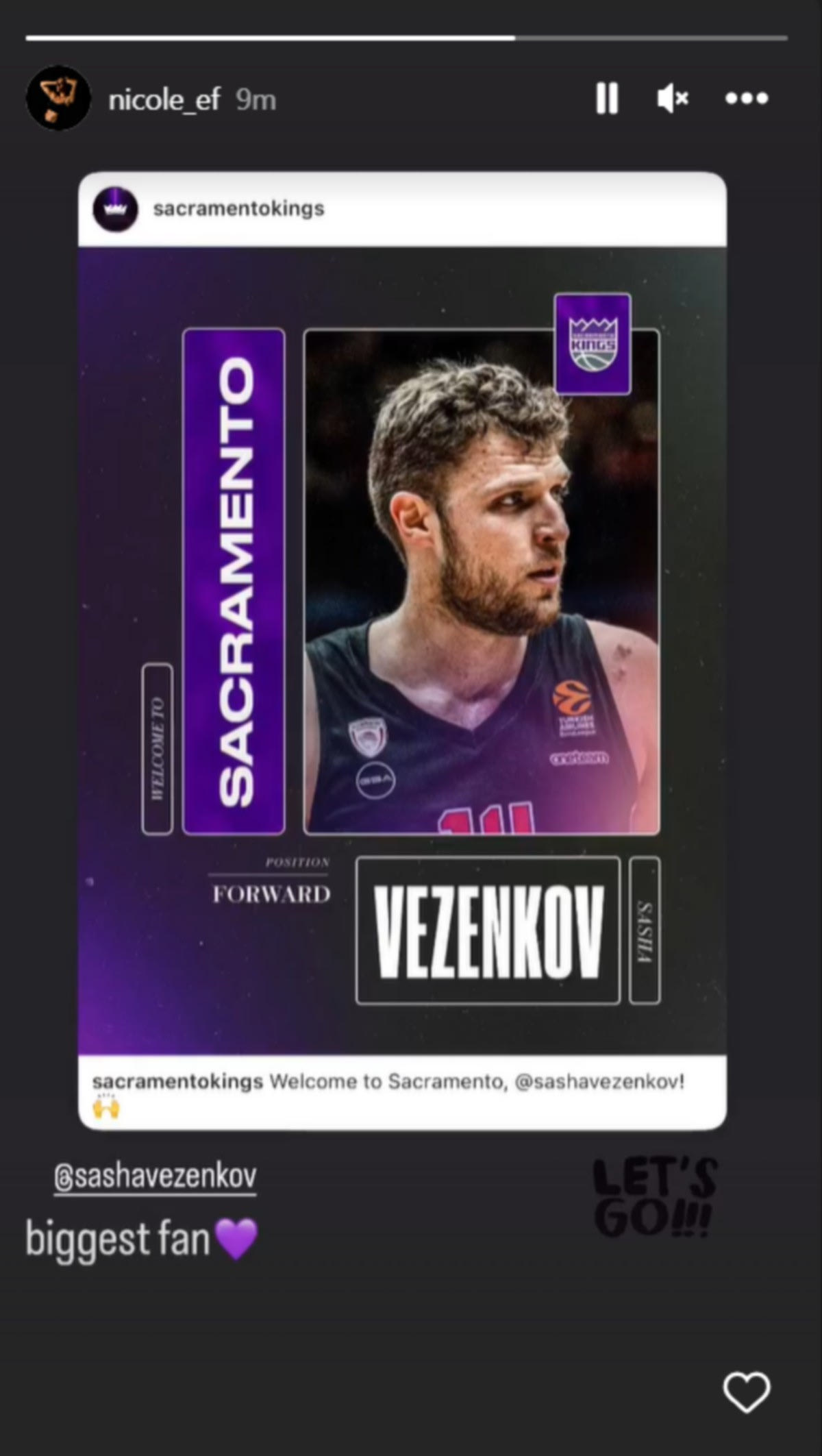 Η ανάρτηση της Νικόλ Ελευθεριάδου, συντρόφου του Σάσα Βεζένκοβ, μετά την ανακοίνωσή του από τους Σακραμέντο Κινγκς.