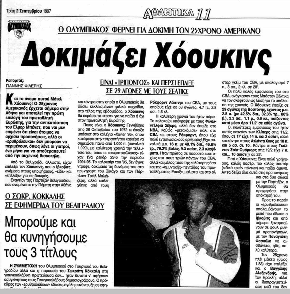 Ο Ολυμπιακός αφήνει τον Μπένετ και επιλέγει τον Μάικλ Χόκινς (ή Χόουκινς, όπως έγραφε η Απογευματινή) Αρχείο Γιάννη Φιλέρη