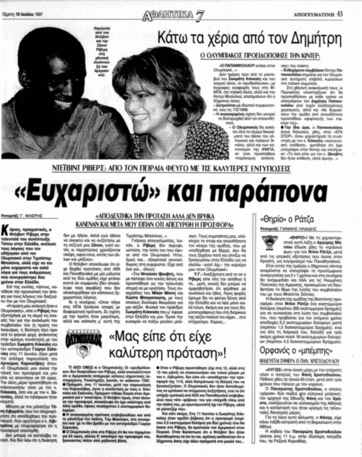 • Την πρώτη, δια στόματος Ρίβερς (στη συνέντευξη Τύπου, που παραχώρησε στις 9 Ιουλίου 1997 κι ενώ είχε συμφωνήσει, ήδη, με την Τιμσίτεμ Μπολόνια): Ο Ολυμπιακός μου έκανε την τελική προσφορά και μου είπε να απαντήσω σε 24 ώρες. Την άλλη μέρα προσπάθησα να επικοινωνήσω με τον κ. Κόκκαλη, όσο και με τον αντιπρόεδρο Γιώργο Σαλονίκη, αλλά τα τηλέφωνα ήταν κλειστά. Μίλησα με τον τζένεραλ μάνατζερ, Τάκη Λιβιεράτο, που τον πληροφόρησα ότι αποδέχθηκα την πρόταση. Λίγο αργότερα ο κ.Λιβιεράτος με πληροφόρησε ότι προσφορά απεσύρθη”.