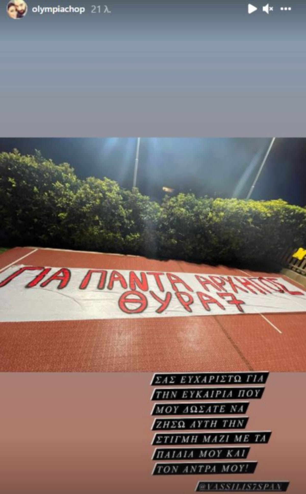 Με μια ανάρτησή της στα social media η Ολυμπία Χοψονίδου έστειλε μήνυμα προς τους οπαδούς του Ολυμπιακού που έκαναν έκπληξη στον Βασίλη Σπανούλη και βρέθηκαν έξω από το σπίτι της οικογένειάς του.