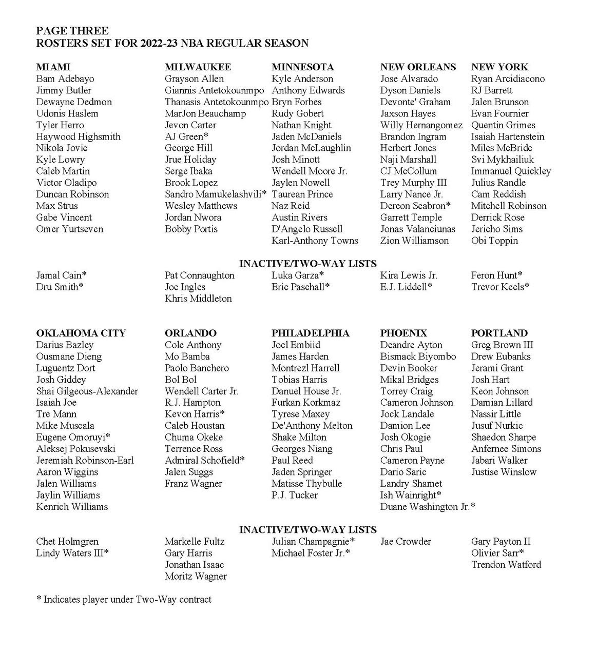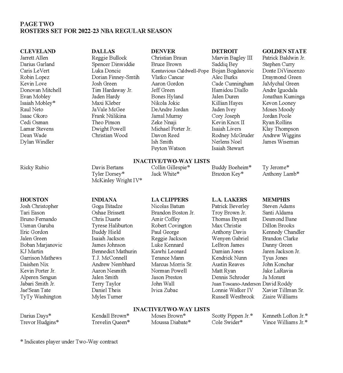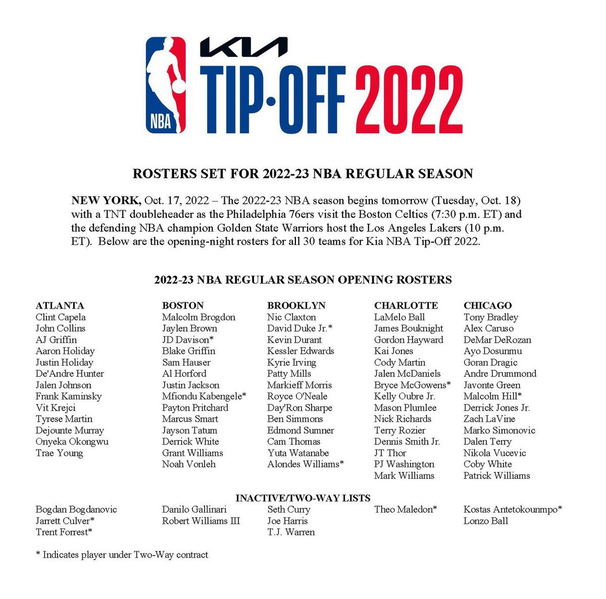 Μία ημέρα πριν από την έναρξη της regular season για τη σεζόν 2022/23, το NBA ανακοίνωσε τα ξημερώματα της Τρίτης (18/10) τα ρόστερ των 30 ομάδων της Λίγκας.