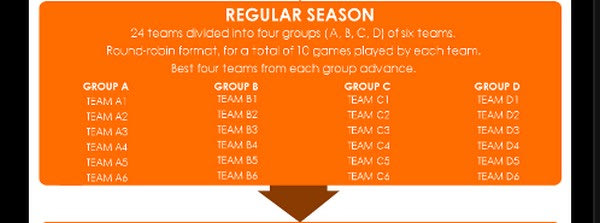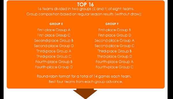 Για παράδειγμα στον 1ο όμιλο της Β’ φάσης (ΤOP-16) θα πηγαίνει ο πρώτος του Α’ ομίλου, ο 2ος του Β’ ομίλου, ο 3ος του Γ’ ομίλου και ο 4ος του Δ’ ομίλου. Ομοίως ο όμιλος θα συμπληρώνεται με τον 1ο του του Γ’ ομίλου, τον 2ο του Δ’, τον 3ο του Α’ και τον 4ο του Β’. Με τον ίδιο τρόπο θα συμπληρώνεται και ο 2ος όμιλος που θα συγκροτείται.